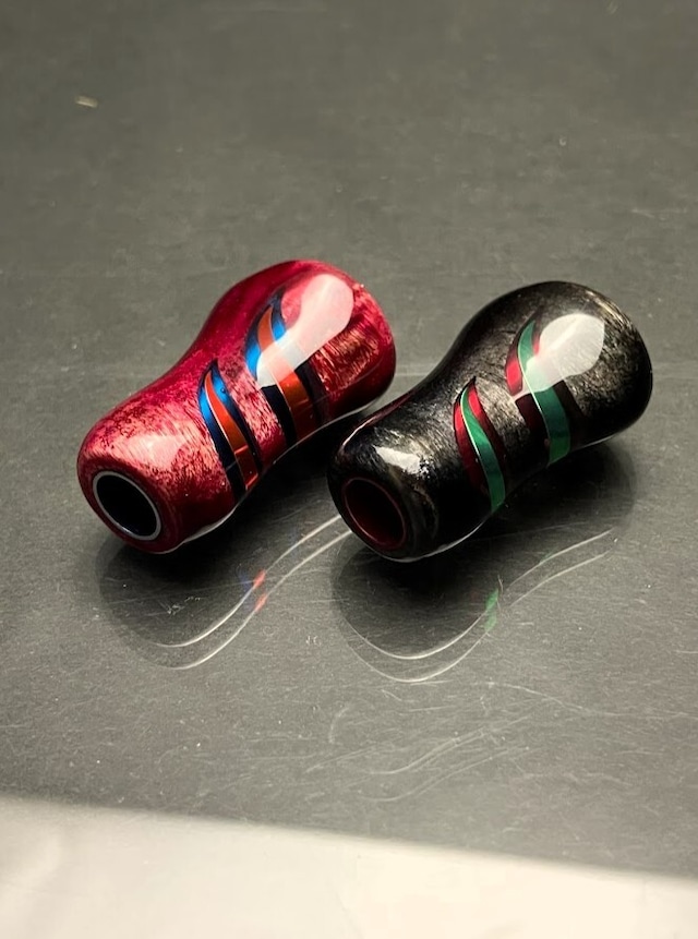 Stabilized Wood & Metal スタビライズドウッド&メタル バーション 『唯一無二のフォルムと輝きをお楽しみください』 Small Gourd Knob スモール ゴォゥド ノブ 【塗装】艶あり 【付属品】キャップ(左ネジ)、ダイワ用スペーサー 【装着可能】ダイワSタイプ、シマノAタイプのハンドルノブに適合 グリップ部はスタビライズドウッドにメタルパーツを埋め込んだぬくもりと輝きの芸術作品。内部のスリーブとスクリューキャップはアルミの削り出しにアルマイト処理を施し耐久性にも優れています。 手にフィットする絶妙な湾曲形状と握り心地を実現。使うたびに癒しを感じさせる、洗練された一品です。