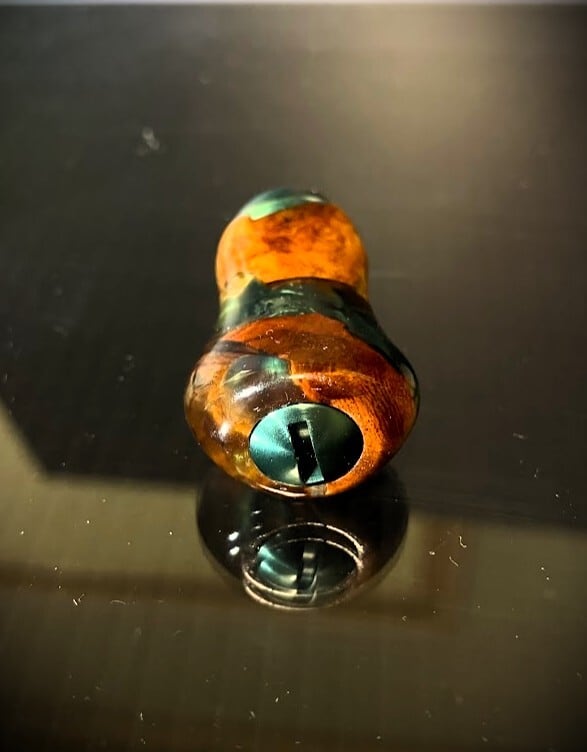 グリップ部は天然木とレジンのハイブリッド、内部のスリーブとスクリューキャップはアルミの削り出し後に表面アルマイト処理(グリーン色)。木材の唯一無二の杢目、指先で包み込めるような程よい湾曲形状のフィット感と握り心地、木ノブの中ではTOPクラスのセンター部の薄さ、また合わせ時に指先がノブから外れる現象を緩和する為、坂道の様な立ち上がり設計で横方向へ抜けにくい、自然木独特の癒され感とお洒落なGourd knobです。