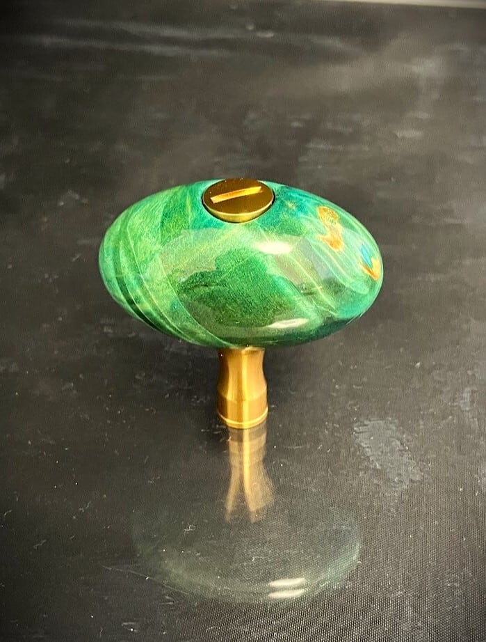 グリップ部は樹脂を浸透させ硬化させ木材の耐候性を高め、木の持つ質感を活かしつつ美しい着色をさせたスタビライズドウッドを採用し、内部のパーツは全てアルミの削り出し後に表面アルマイト処理(ゴールド色)。スタビの唯一無二の色合い、握りやすさと力の入り方は抜群!また広大な海でのファイトに良く似合うルックス。大き目なWoodだけに存在感が圧倒的で希少性の高いお洒落なCocoon knobです。